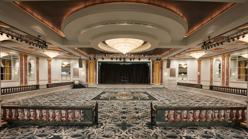 Šajā ikoniskajā viesnīcā iestieptie griesti tiek izmantoti, lai radītu iespaidīgu un elegantu atmosfēru.